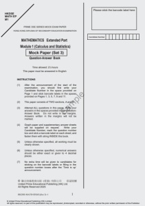 HKDSE-MATH-EP(M1)(Set 3) − 1 1 MATHEMATICS Extended Part Module 1 (Calculus and Statistics) Question-Answer Book Time allowed: 2½ hours This paper must be answered in English INSTRUCTIONS (1) After the announcement of the start of the examination, you should first write your Candidate Number in the space provided on Page 1 and stick barcode labels in the spaces provided on Pages 1, 3, 5, 7, 9 and 11. (2) This paper consists of TWO sections, A and B. (3) Attempt ALL questions in this paper. Write your answers in the spaces provided in this Question- Answer Book. Do not write in the margins. Answers written in the margins will not be marked. (4) Graph paper and supplementary answer sheets will be supplied on request. Write your Candidate Number, mark the question number box and stick a barcode label on each sheet, and fasten them with string INSIDE this book. (5) Unless otherwise specified, all working must be clearly shown. (6) Unless otherwise specified, numerical answers should be either exact or given to 4 decimal places. (7) No extra time will be given to candidates for sticking on the barcode labels or filling in the question number boxes after the ‘Time is up’ announcement. HKDSE MATH EP M1 PRIME DSE SERIES MOCK EXAM PAPER HONG KONG DIPLOMA OF SECONDARY EDUCATION EXAMINATION Candidate Number © 聯合培進教育出版 ( 香港 ) 有限公司 保留版權 United Prime Educational Publishing (HK) Ltd. All Rights Reserved 2025 Please stick the barcode label here Mock Paper (Set 3 ) Sample © United Prime Educational Publishing (HK) Limited All rights reserved; no part of this publication may be reproduced, photocopied, recorded or otherwise, without the prior written permission of the Publisher.