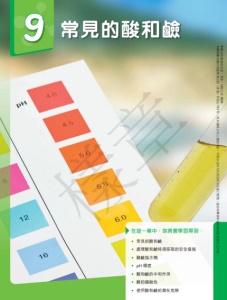2. pH 標度 在我們學習如何使用通用指示劑和 pH 試紙前,要先理解 pH值 是甚麼。 pH 值是用來表示物質的酸鹼度。 pH 值範圍一般是由 0 至 14 ,這個範圍稱為 pH標度 。 在 pH 標度中, • 酸性物質的 pH 值低於 7。 pH 值越低,表示物質的酸度越高。 • 鹼性物質的 pH 值高於 7。 pH 值越高,表示物質的鹼度越高。 • 中性物質的 pH 值等於 7。 所以,在以上的 pH 標度中, pH 值為 0 的物質酸度最高, pH 值 為 14 的物質則鹼度最高。每一隻顏色都代表一個 pH 值。 • 不同品牌的通用指示劑 或 pH 試紙可能會顯示不同 的 pH 值範圍。 • 有些品牌的通用指示劑 可能會用不同的顏色來顯示 pH 值。 圖 9.9 pH 標度(相片顯示通用指示劑溶液在不同 pH 值的溶液中的顏色。) 酸度增加 鹼度增加 pH 值 中性 鹼性 8 9 10 11 12 13 14 0 1 2 3 4 5 6 7 酸性 pH 值 pH value pH 標度 pH scale 16 常見的酸和鹼 © 聯合培進教育出版(香港)有限公司 2024 本書版權為聯合培進教育出版(香港)有限公司所有。如未獲得公司之書面同意,不得以任何方式或任何手段進行複製、儲存或轉發本書全部或任何部分之內容。 樣章